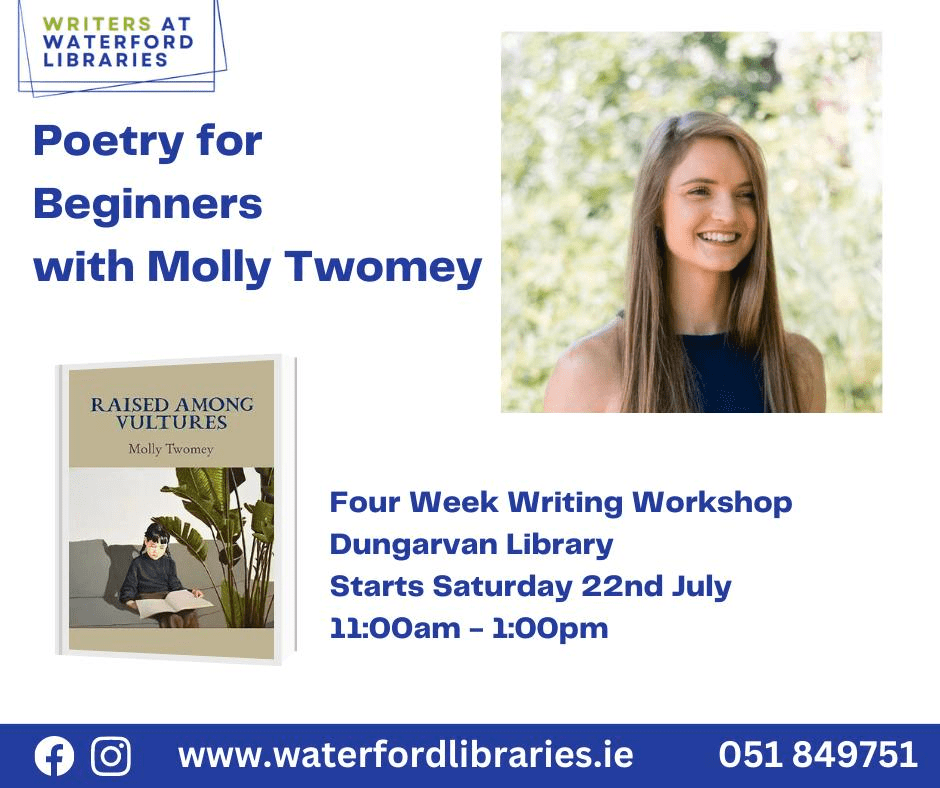 Molly Twomey will be a guest at ‘Borrow a Poet’ at Cork City Library where she will dissect one of her poems, divulging its origins, influences, and the skills that make it impactful. She will also provide a writing prompt for attendees to explore and deepen their own craft.